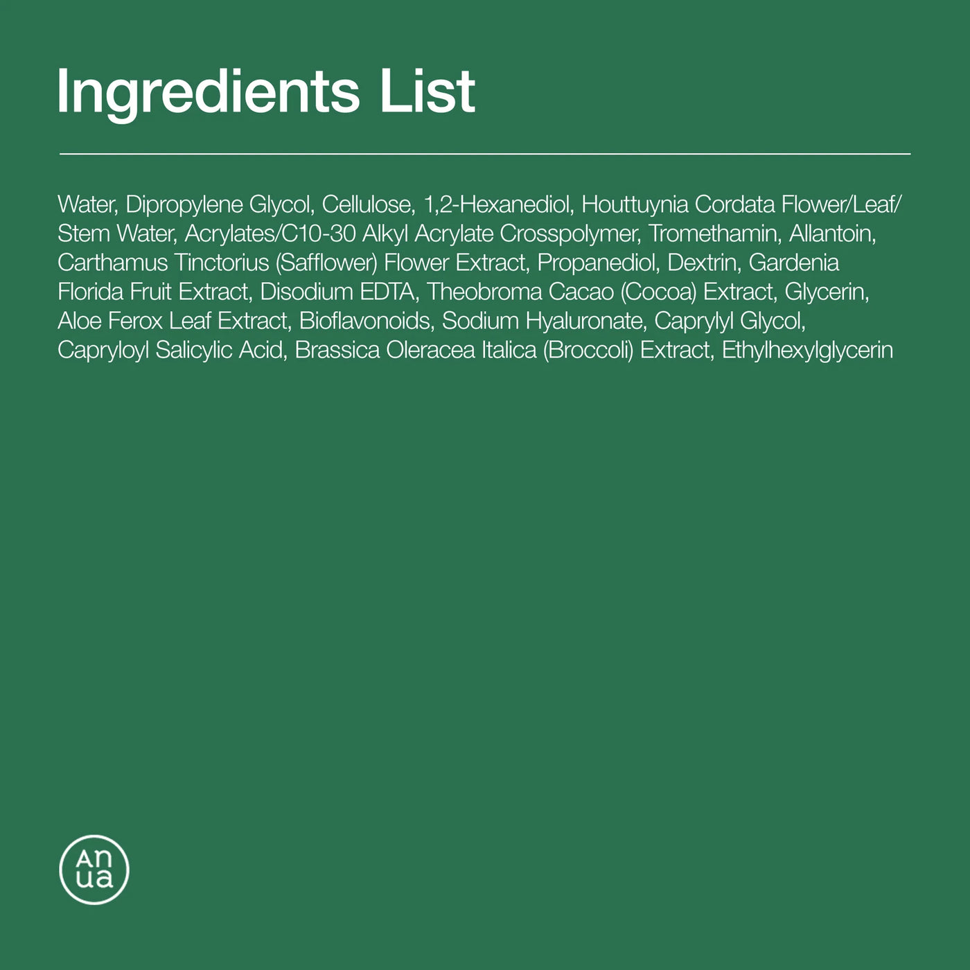 Water, Dipropylene Glycol, Cellulose, 1,2-Hexanedio, Arginine, Acrylates/C10-30 Alkyl Acrylate Crosspolymer, Propanediol, Allantoin, Carthamus Tinctorius (Safflower) Flower Extract, Dextrin, Polyglyceryl-10 Laurate, Gardenia Jasminoides Fruit Extract, Disodium EDTA, Theobroma Cacao (Cocoa) Extract, Glycerin,Houttuynia cordata Extract, Aloe Ferox Leaf Extract, Bioflavonoids, Sodium Hyaluronate, Caprylyl Glycol, Capryloyl Salicylic Acid, Brassica Oleracea Italica (Broccoli) Extract, Ethylhexylglycerin