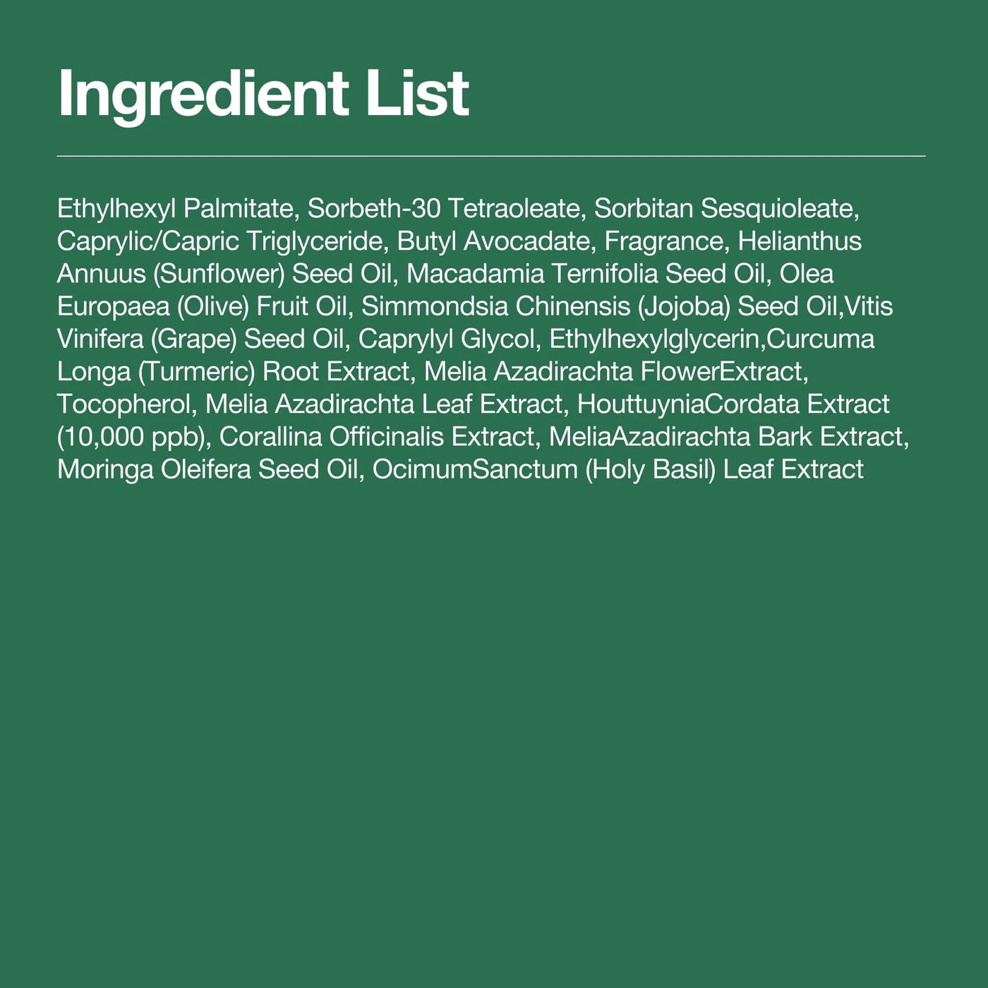 Ethylhexyl Palmitate, Sorbeth-30 Tetraoleate, Sorbitan Sesquioleate, Caprylic/Capric Triglyceride, Butyl Avocadate, Fragrance, Helianthus Annuus (Sunflower) Seed Oil, Macadamia Ternifolia Seed Oil, Olea Europaea (Olive) Fruit Oil, Simmondsia Chinensis (Jojoba) Seed Oil, Vitis Vinifera (Grape) Seed Oil, Caprylyl Glycol, Ethylhexylglycerin, Curcuma Longa (Turmeric) Root Extract, Melia Azadirachta Flower Extract, Tocopherol, Melia Azadirachta Leaf Extract, Houttuynia Cordata Extract, Corallina Officinalis Extract, Melia Azadirachta Bark Extract, Moringa Oleifera Seed Oil, Ocimum Sanctum Leaf Extract