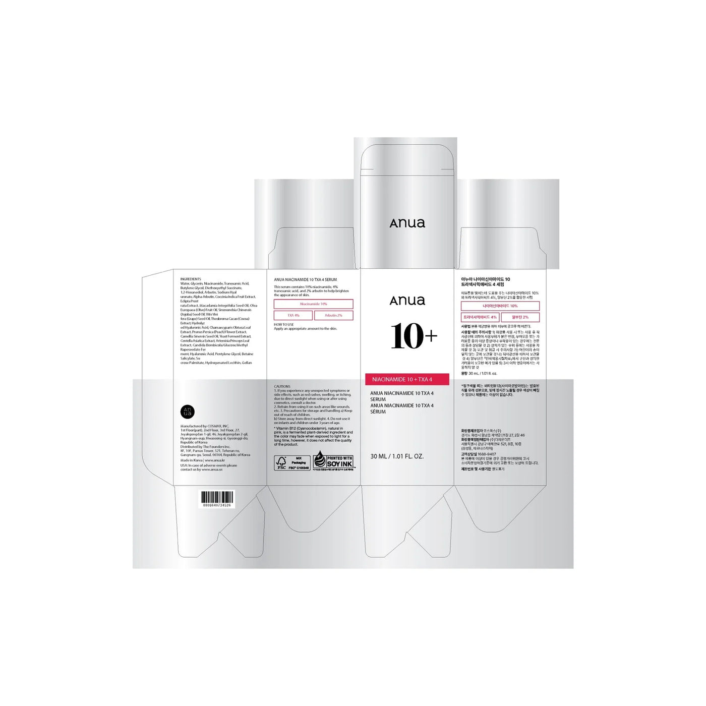 Water, Glycerin, Niacinamide, Tranexamic Acid, Butylene Glycol, Diethoxyethyl Succinate, 1,2-Hexanediol, Arbutin, Sodium Hyaluronate, Alpha-Arbutin, Coccinia Indica Fruit Extract, Eclipta Prostrata Extract, Macadamia Integrifolia Seed Oil, Olea Europaea (Olive) Fruit Oil, Simmondsia Chinensis (Jojoba) Seed Oil, Vitis Vinifera (Grape) Seed Oil, Theobroma Cacao (Cocoa) Extract, Hydrolyzed Hyaluronic Acid, Chamaecyparis Obtusa Leaf Extract, Prunus Persica (Peach) Flower Extract, Camellia Sinensis Seed Oil, Yeast Ferment Extract, Centella Asiatica Extract, Artemisia Princeps Leaf Extract, Candida Bombicola/Glucose/Methyl Rapeseedate Ferment, Hyaluronic Acid, Pentylene Glycol, Betaine Salicylate, Sucrose Palmitate, Hydrogenated Lecithin, Gellan Gum, Sodium Phytate, Cellulose, Caprylic/Capric Triglyceride, Panthenol, Cyanocobalamin, Polyglutamic Acid, 3-O-Ethyl Ascorbic Acid, Ceramide NP, Dextrin, Asiaticoside, Madecassic Acid, Asiatic Acid, Dimethylsilanol Hyaluronate, Hydrolyzed Sodium Hyaluronate, Potassium Hyaluronate, Hydroxypropyltrimonium Hyaluronate, Sodium Hyaluronate Crosspolymer, Sodium Hyaluronate Dimethylsilanol, Sodium Acetylated Hyaluronate, Xanthan Gum